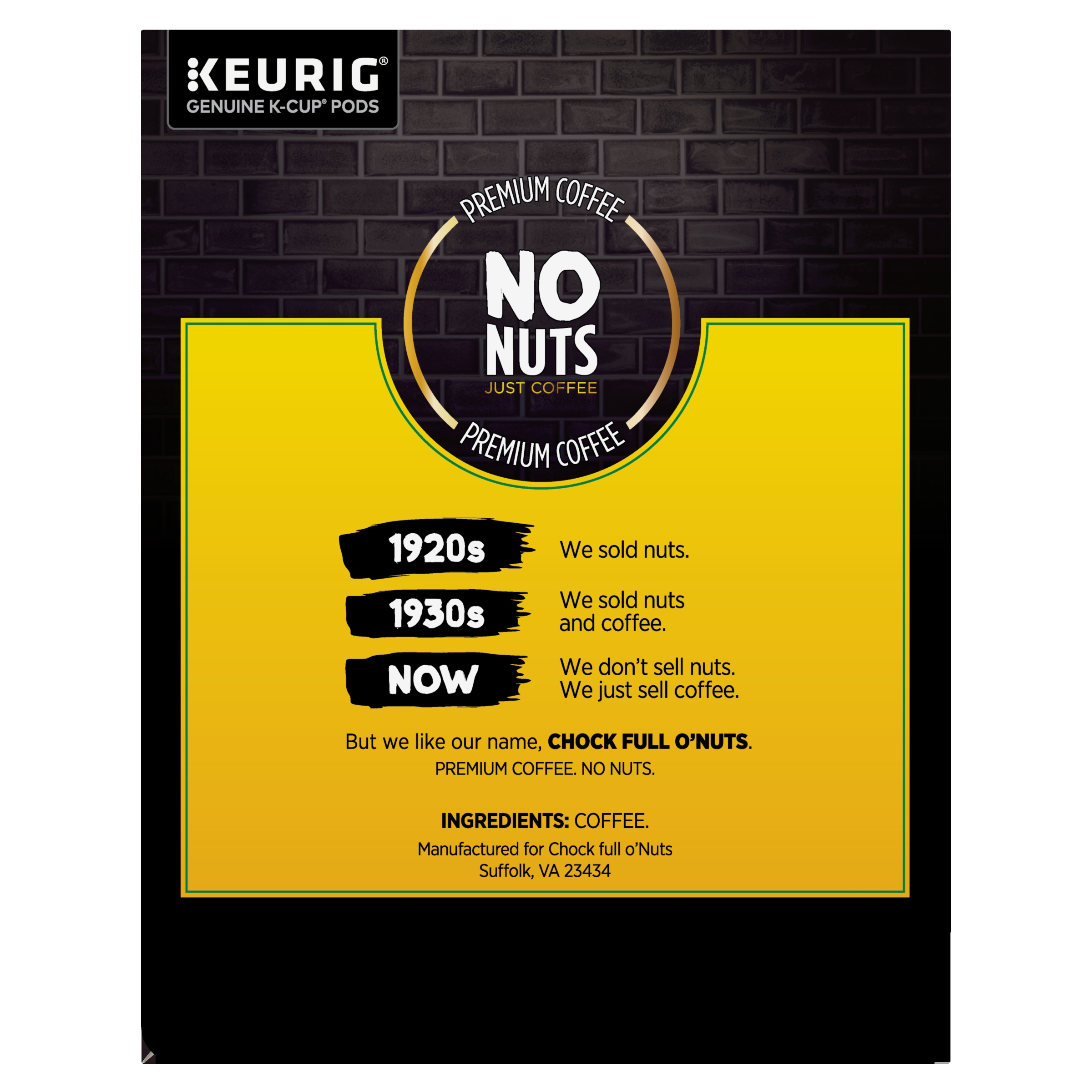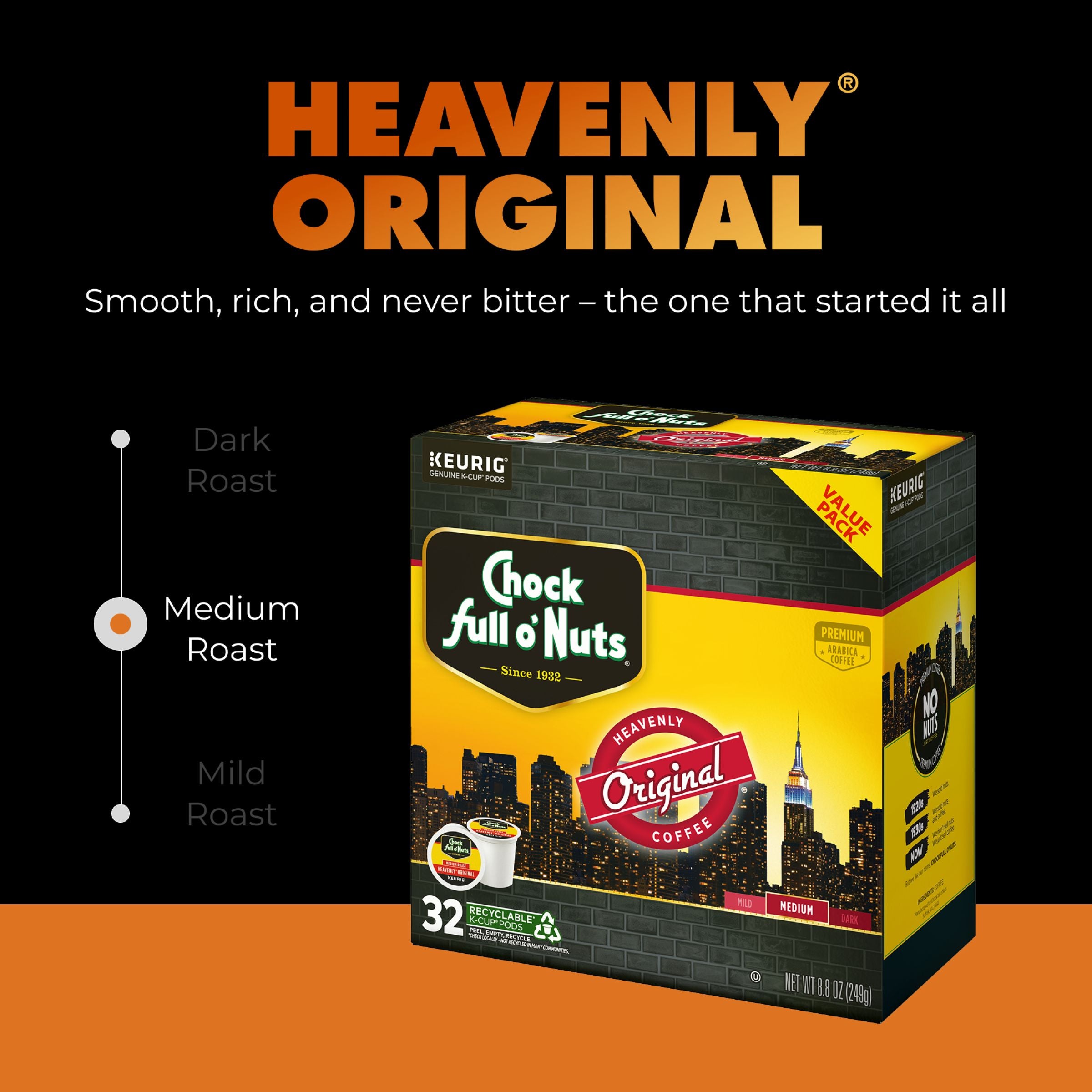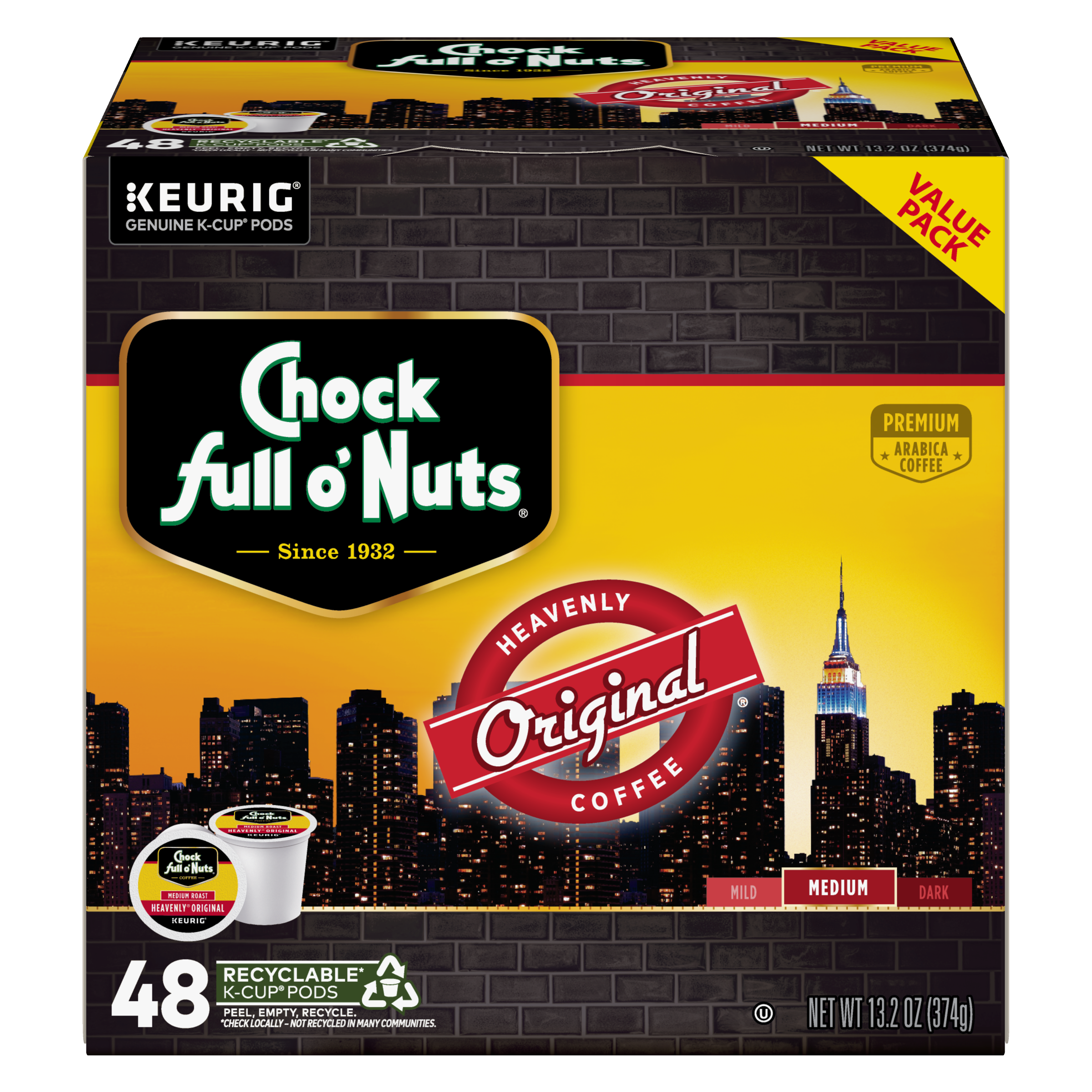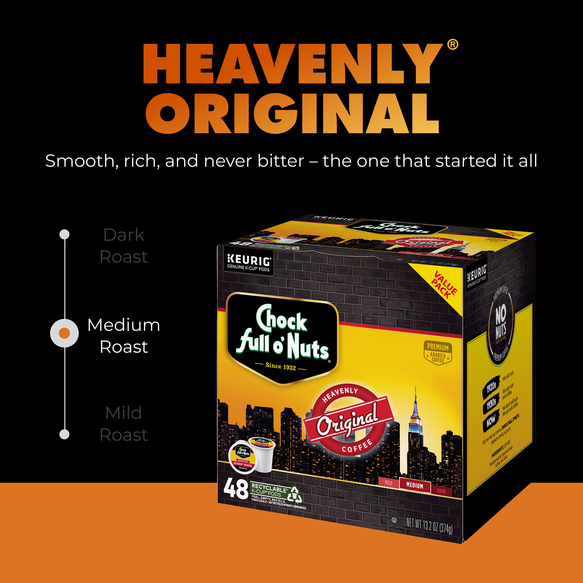 Since 1932, coffee lovers have been starting their day with Chock full o’Nuts®. Chock full o’Nuts® Original Roast medium blend coffee is the one that started it all. A rich, full-bodied blend that is smooth, not bitter or acidic, our Original Roast is the perfectly drinkable everyday coffee. This Heavenly Original Medium Roast is made from premium coffee beans that are hand-selected from the finest growing regions. Starting from our first coffee shop on Broadway in New York City, Chock full o’Nuts® has been roasting perfectly flavored, aromatic coffee for nearly 100 years. Now you can enjoy an amazing cup of coffee day or night with our easy-to-use K-Cup® pods. Chock full o'Nuts®
